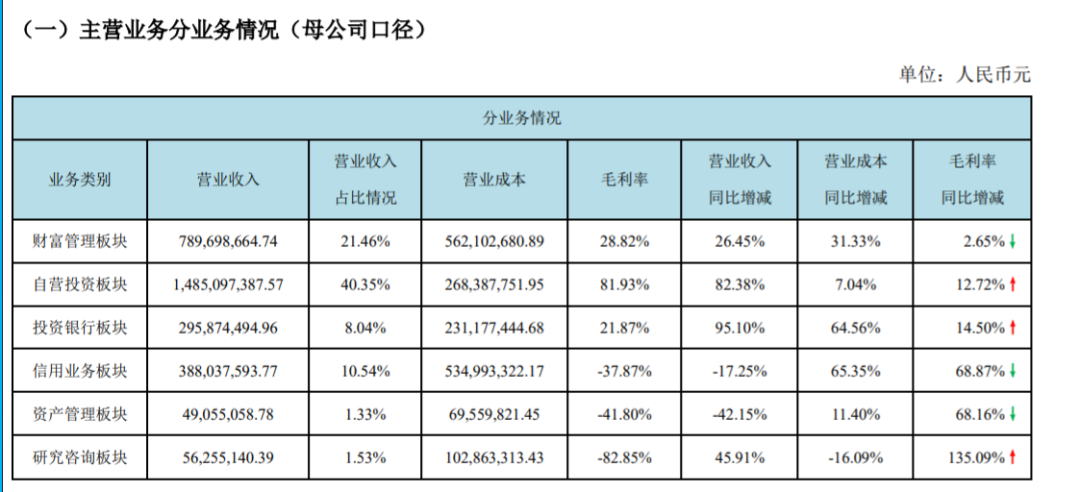 除了资管业务外,就母公司口径来看,西部证券信用业务、研究咨询两个板块也出现亏损。其中信用业务全年营收3.88亿元,同比下滑17%,但营业成本则达5.35亿元,导致亏损;研究咨询业务营收0.56亿元,但营业成本达1.03亿元,亦现亏损。